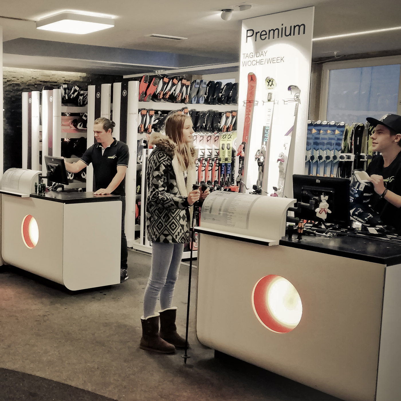 At our store next to the Giggijochbahn cable car you'll find the largest selection of winter sports equipment as well as separate departments for board sports, touring clothing and sports underwear. Moreover you can take some refreshment in the lounge and let us take care of your personally adjusted skis or snowboard.